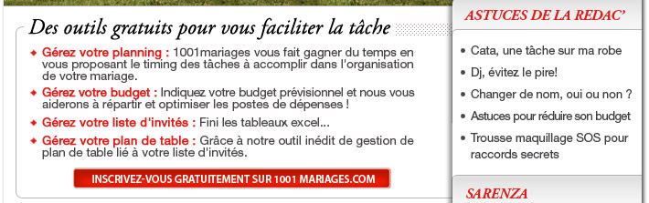 Voir la démo des outils Sarenza - Des chaussures pour toute la famille Trousse maquillage SOS pour raccords secrets Astuces pour réduire son budget Changer de nom, oui ou non? Dj, évitez le pire! Cata, une tâche sur ma robe Voir la démo des outils Inscrivez-vous gratuitement sur 1001mariages.com