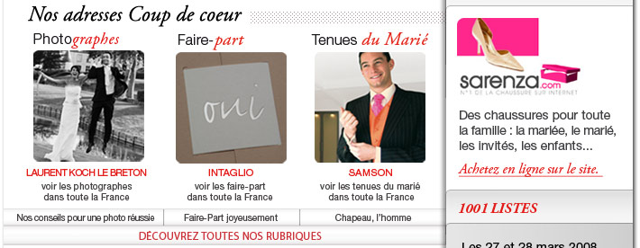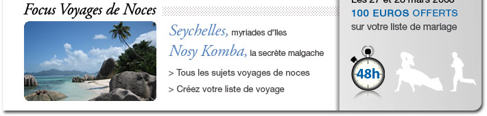 voir toutes les tenues du marié voir tous les créateurs de faire-part voir tous les photographes Photgraphe, Laurent Koch le Breton Faire-part, Intaglio Tenues du marié, Samson voir tous les photographes voir tous les créateurs de faire-part voir toutes les tenues du marié Sarenza - Des chaussures pour toute la famille Seychelles, myriades d’iles Nosy Koma, la secrète malgache Tous les sujets voyages de noces >>créez sa liste de voyage Offre spécial 1001 listes - 100 € offert Voir la démo des outils Trousse maquillage SOS pour raccords secretsAstuces pour réduire son budget Changer de nom, oui ou non?Dj, évitez le pire! Cata, une tâche sur ma robe